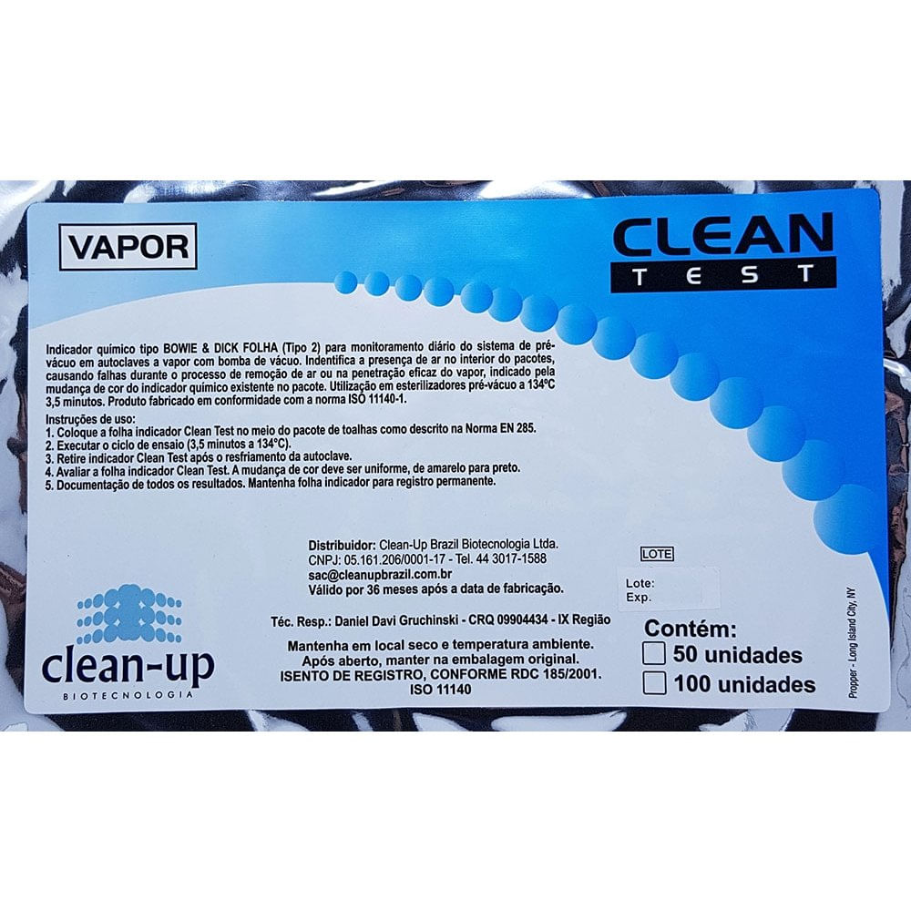 O integrador CLEAN TEST possui uma tinta indicadora que muda de rosa para marrom e apresenta uma resposta integrada com os parâmetros críticos da esterilização: Vapor, tempo e temperatura/pressão. Proporciona uma leitura fácil e imediata, possui uma camada plástica que impede que a tinta do indicador entre em contato com os instrumentos esterilizados.