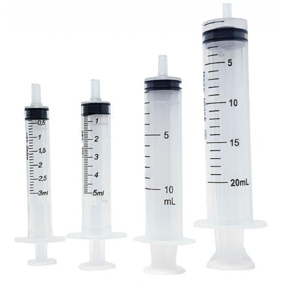 São disponíveis em Bico Rosca Metal (Luer Lock) e Bico Liso de Vidro (Slip), com variação de tamanhos (ML) entre si.